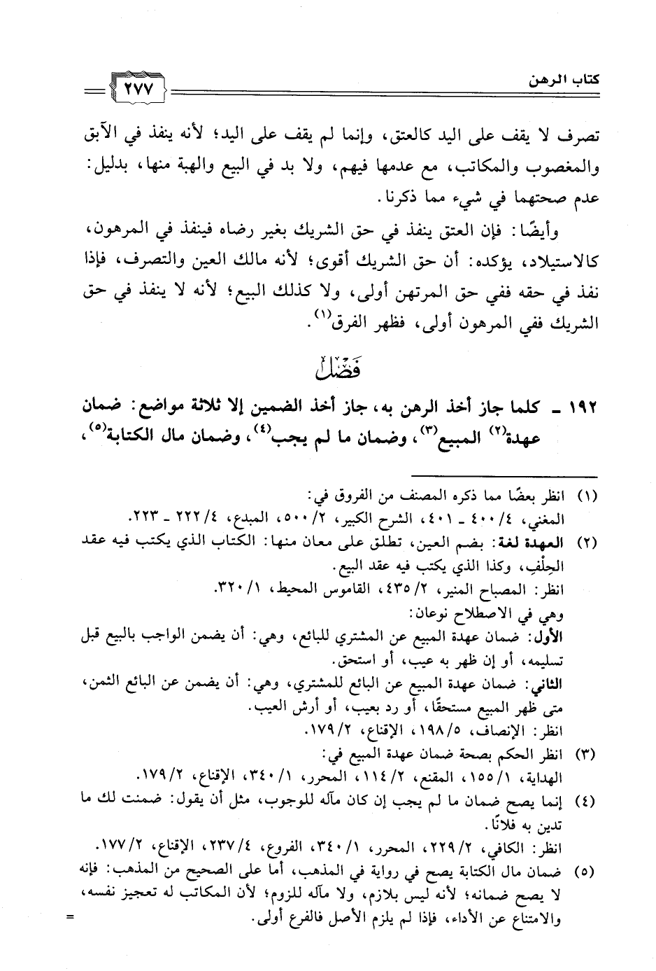 ١٩٢ - كلما جاز أخذ الرهن به، جاز أخذ الضمين إلا ثلاثة مواضع: ضمان عهدة (٢) المبيع (٣)، وضمان ما لم يجب (٤)، وضمان مال الكتابة (٥)،