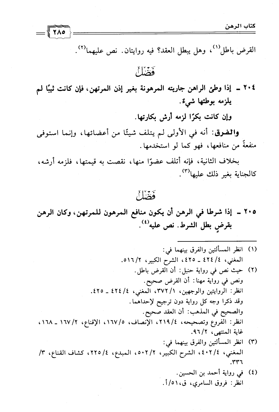 ٢٠٥ - إذا شرطا في الرهن أن يكون منافع المرهون للمرتهن، وكان الرهن بقرضٍ بطل الشرط. نص عليه (٤).