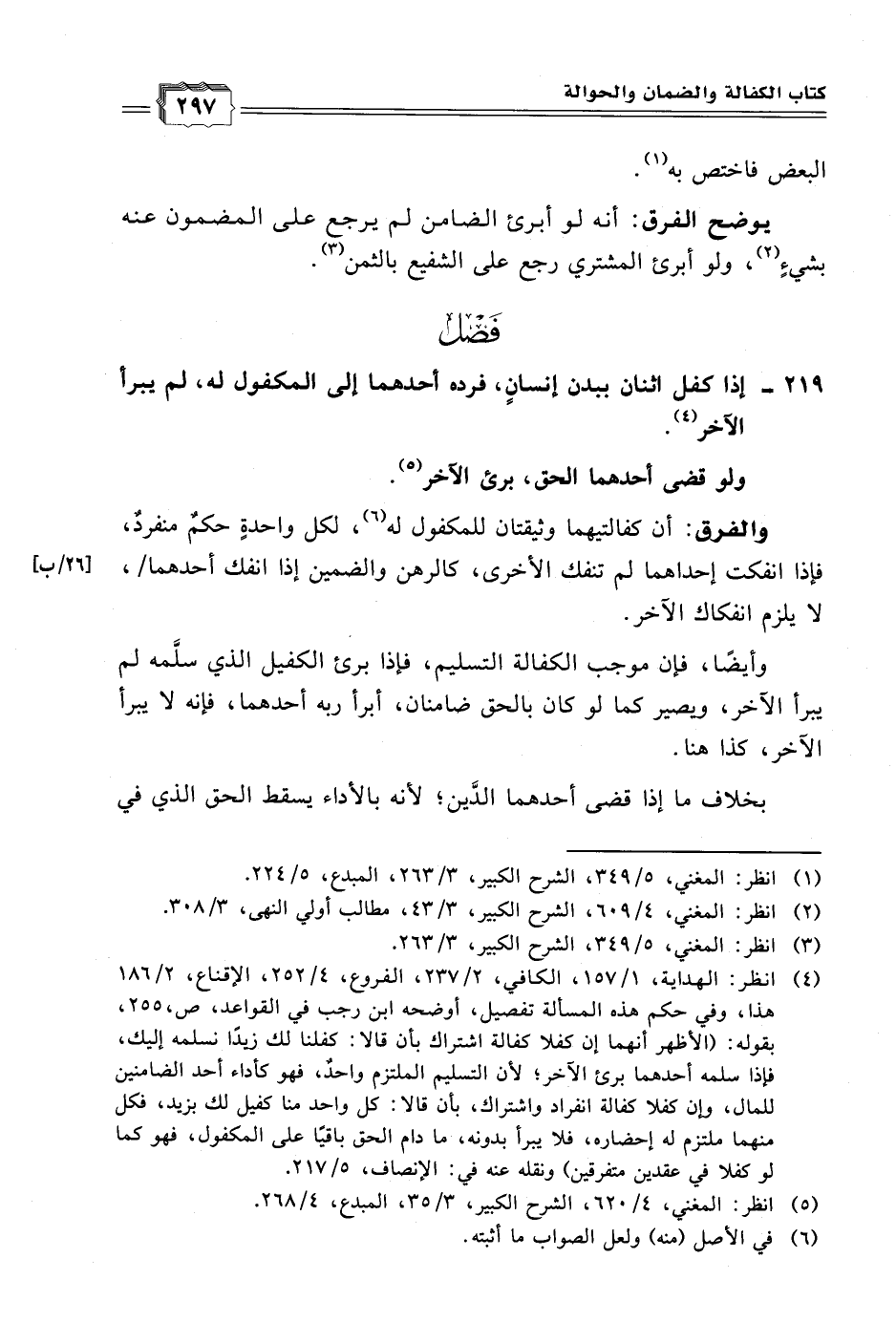 (٤) انظر: الهدا ية، ١/ ١٥٧، الكافي، ٢/ ٢٣٧، الفروع، ٤/ ٢٥٢، الإقناع، ٢/ ١٨٦ هذا، وفي حكم هذه المسألة تفصيل، أوضحه ابن رجب في القواعد، ص، ٢٥٥، بقوله: (الأظهر أنهما إن كفلا كفالة اشتراك بأن قالا: كفلنا لك زيدًا نسلمه إليك، فهذا سلمه أحدهما برئ الآخر؛ لأن التسليم الملتزم واحدٌ، فهو كأداء أحد الضامنين للمال، وإن كفلا كفالة انفراد واشتراك، بأن قالا: كل واحد منا كفيل لك يزيد، فكل منهما ملتزم له إحضاره، فلا يبرأ بدونه، ما دام الحق باقيًا على المكفول، فهو كما لو كفلا في عقدين متفرقين) ونقله عنه في: الإنصاف، ٥/ ٢١٧.