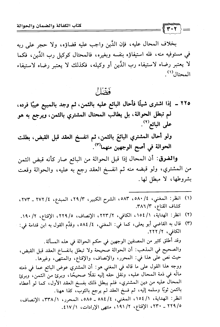 ٢٢٥ - إذا اشترى شيئًا فأحال البائع عليه بالثمن، ثم وجد بالمبيع عيبًا فرده، لم تبطل الحوالة، بل يطالب المحتال المشتري بالثمن، ويرجع به هو على البائع (٢).