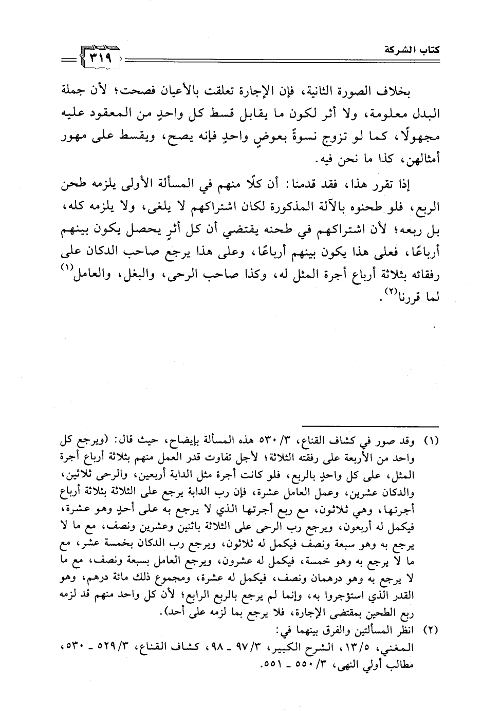(١) وقد صور في كشاف القناع، ٣/ ٥٣٠ هذه المسألة بإيضاح، حيث قال: (ويرجع كل واحد من الأربعة على رفقته الثلاثة؛ لأجل تفاوت قدر العمل منهم بثلاثة أرباع أجرة المثل، على كل واحدٍ بالربع، فلو كانت أجرة مثل الدابة أربعين، والرحى ثلاثين،