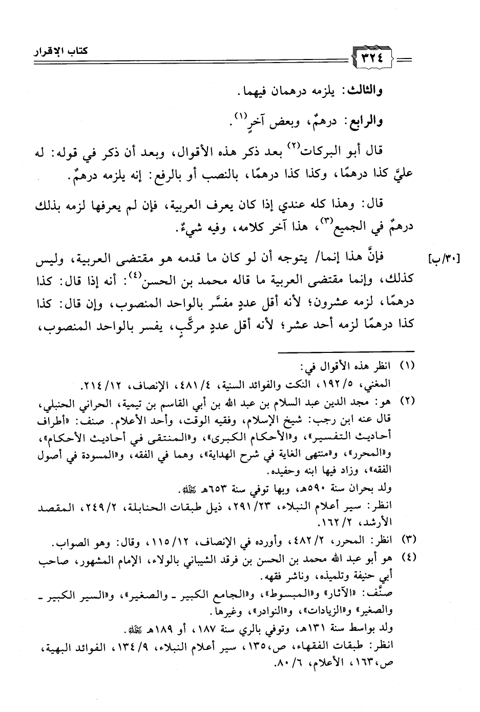 قال أبو البركات (٢) بعد ذكر هذه الأقوال، وبعد أن ذكر في قوله: له عليَّ كذا درهمًا، وكذا كذا درهمًا، بالنصب أو بالرفع: إنه يلزمه درهمٌ.