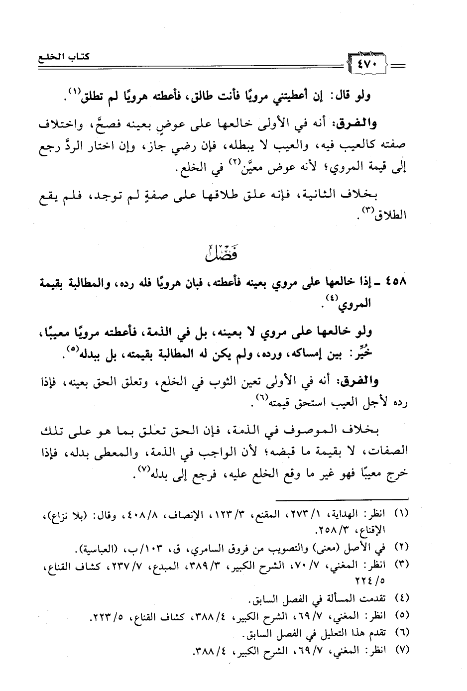 ٤٥٨ - إذا خالعها على مروي بعينه فأعطته، فبان هرويًا فله رده، والمطالبة بقيمة المروي (٤).