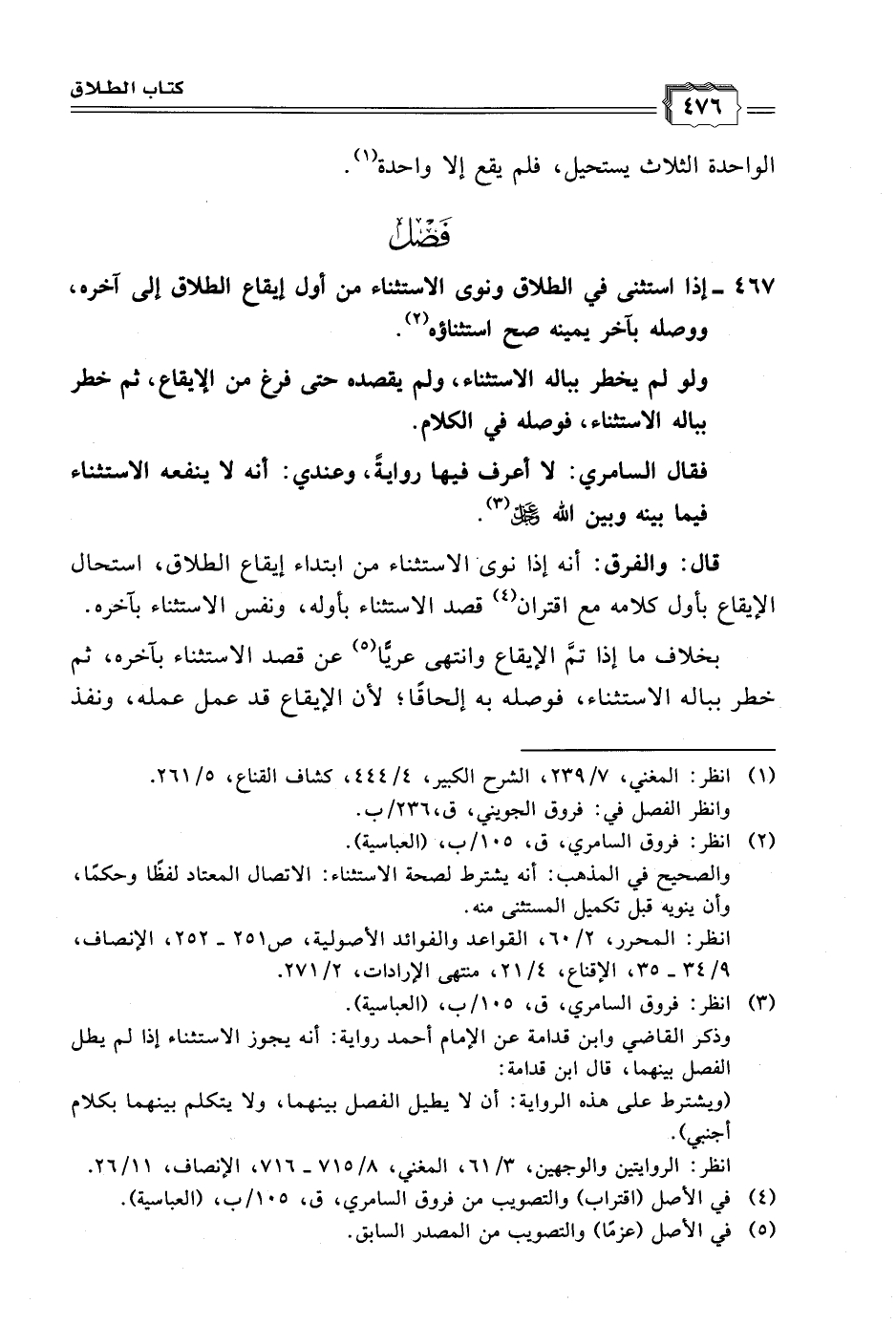 قال: والفرق: أنه إذا نوى الاستثناء من ابتداء إيقاع الطلاق، استحال الإيقاع بأول كلامه مع اقتران (٤) قصد الاستثناء بأوله، ونفس الاستثناء بآخره.
