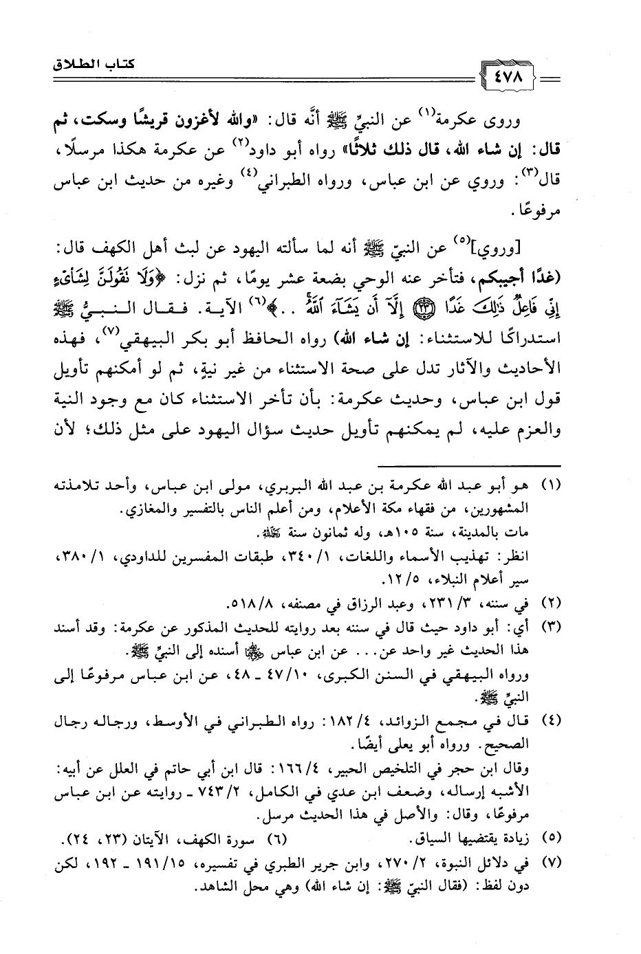 [وروي] (٥) عن النبيّ - صلى الله عليه وسلم - أنه لما سألته اليهود عن لبث أهل الكهف قال: (غدًاِ أجيبِكم، فتأخر عنه الوحي بضعة عشر يومًا، ثم نزل: {وَلَا تَقُولَنَّ لِشَيْءٍ إِنِّي فَاعِلٌ ذَلِكَ غَدًا (٢٣) إِلَّا أَنْ يَشَاءَ اللَّهُ} (٦) الآية. فقال النبى - صلى الله عليه وسلم - استدراكًا للاستثناء: إن شاء الله) رواه الحافظ أبو بكر البيهقي (٧)، فهذه الأحاديث والآثار تدل على صحة الاستثناء من غير نيةٍ، ثم لو أمكنهم تأويل قول ابن عباس، وحديث عكرمة: بأن تأخر الاستثناء كان مع وجود النية والعزم عليه، لم يمكنهم تأويل حديث سؤال اليهود على مثل ذلك؛ لأن