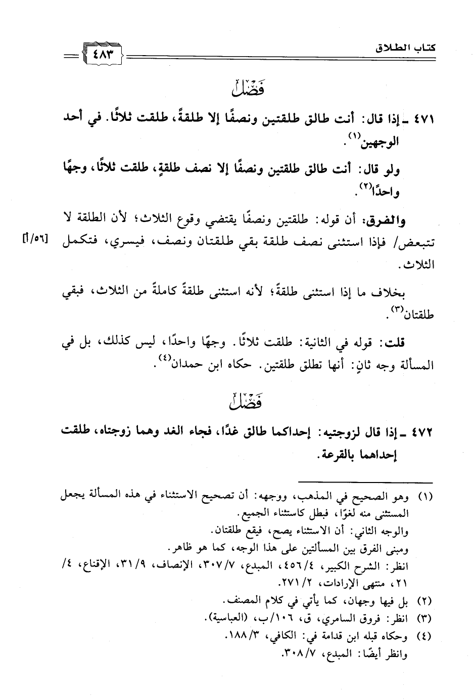 قلت: قوله في الثانية: طلقت ثلاثًا. وجهًا واحدًا، ليس كذلك، بل في المسألة وجه ثانٍ: أنها تطلق طلقتين. حكاه ابن حمدان (٤).