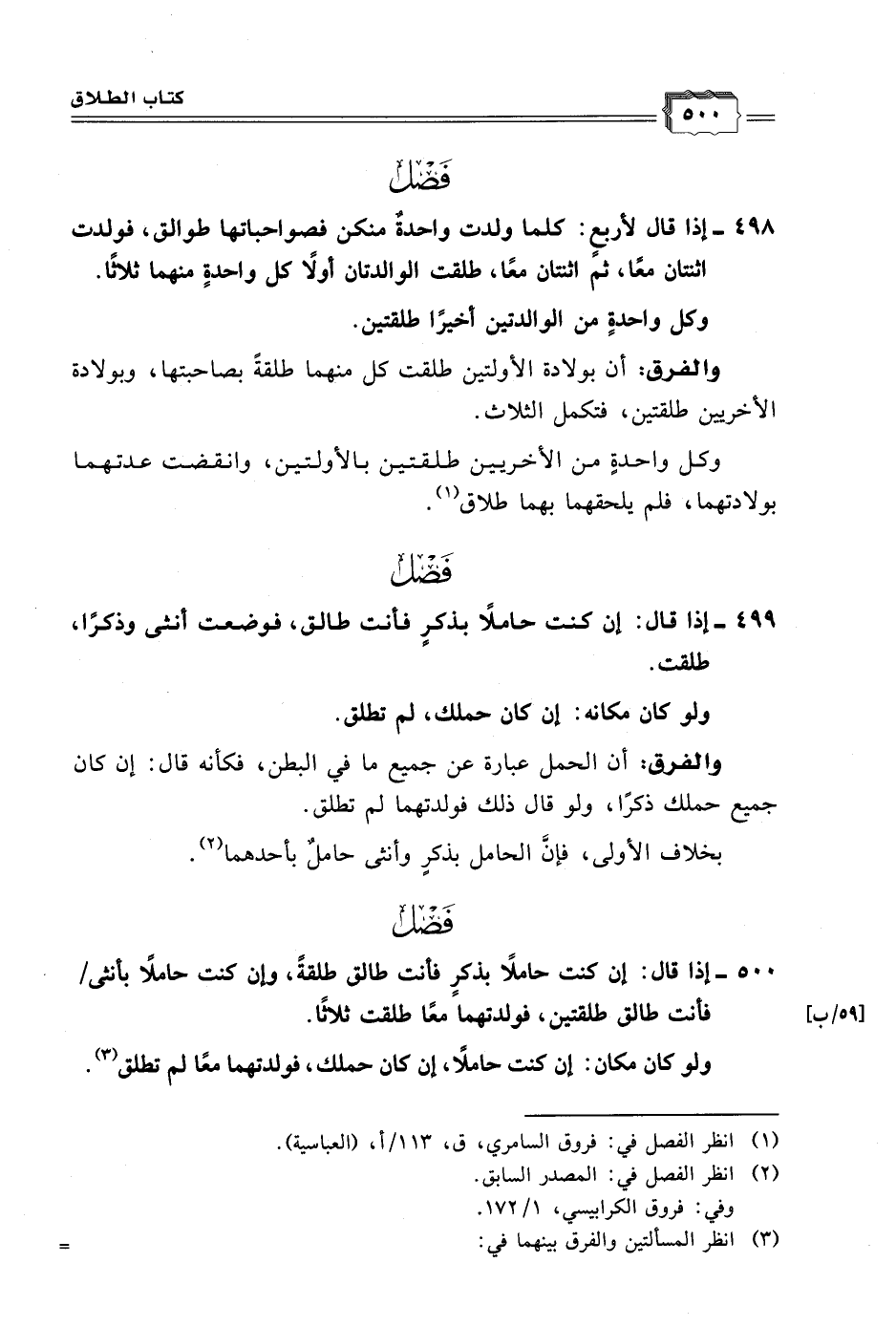 ٥٠٠ - إذا قال: إن كنت حاملًا بذكرٍ فأنت طالق طلقةً، وإن كنت حاملًا بأنثى/ [٥٩/ب] فأنت طالق طلقتين، فولدتهما معًا طلقت ثلاثًا.
