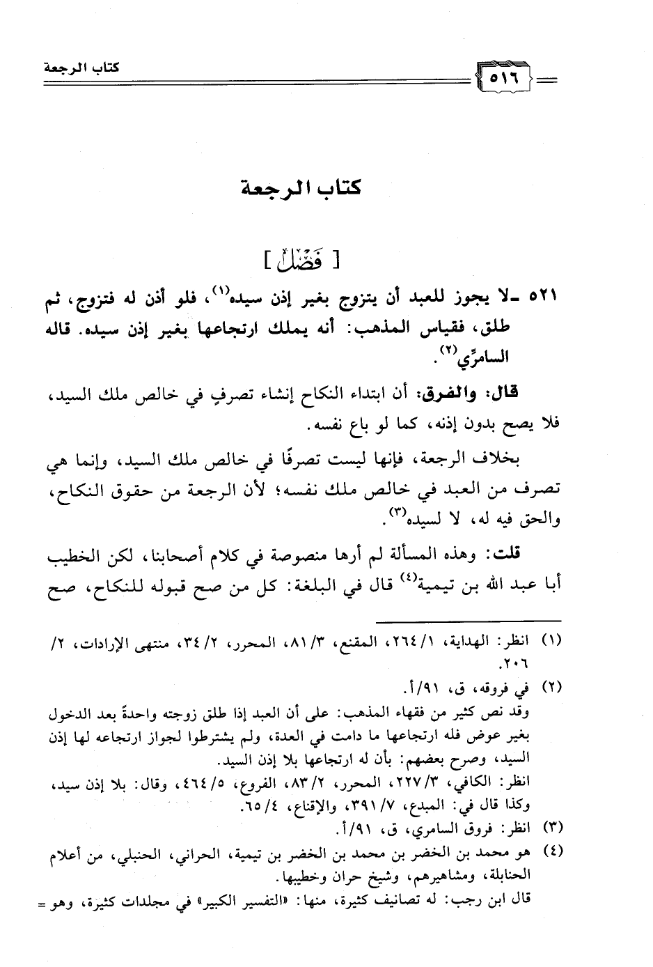 ٥٢١ - لا يجوز للعبد أن يتزوج بغير إذن سيده (١)، فلو أذن له فتزوج، ثم طلق، فقياس المذهب: أنه يملك ارتجاعها بغير إذن سيده. قاله السامرِّي (٢).