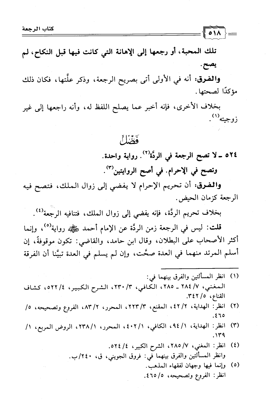 قلت: ليس في الرجعة زمن الردَّة عن الإمام أحمد - رضي الله عنه - رواية (٥)، وإنما أكثر الأصحاب على البطلان، وقال ابن حامد، والقاضي: تكون موقوفةً، إن أسلم المرتد منهما في العدة صحَّت، وإن لم يسلم في العدة تبيَّنا أن الفرقة