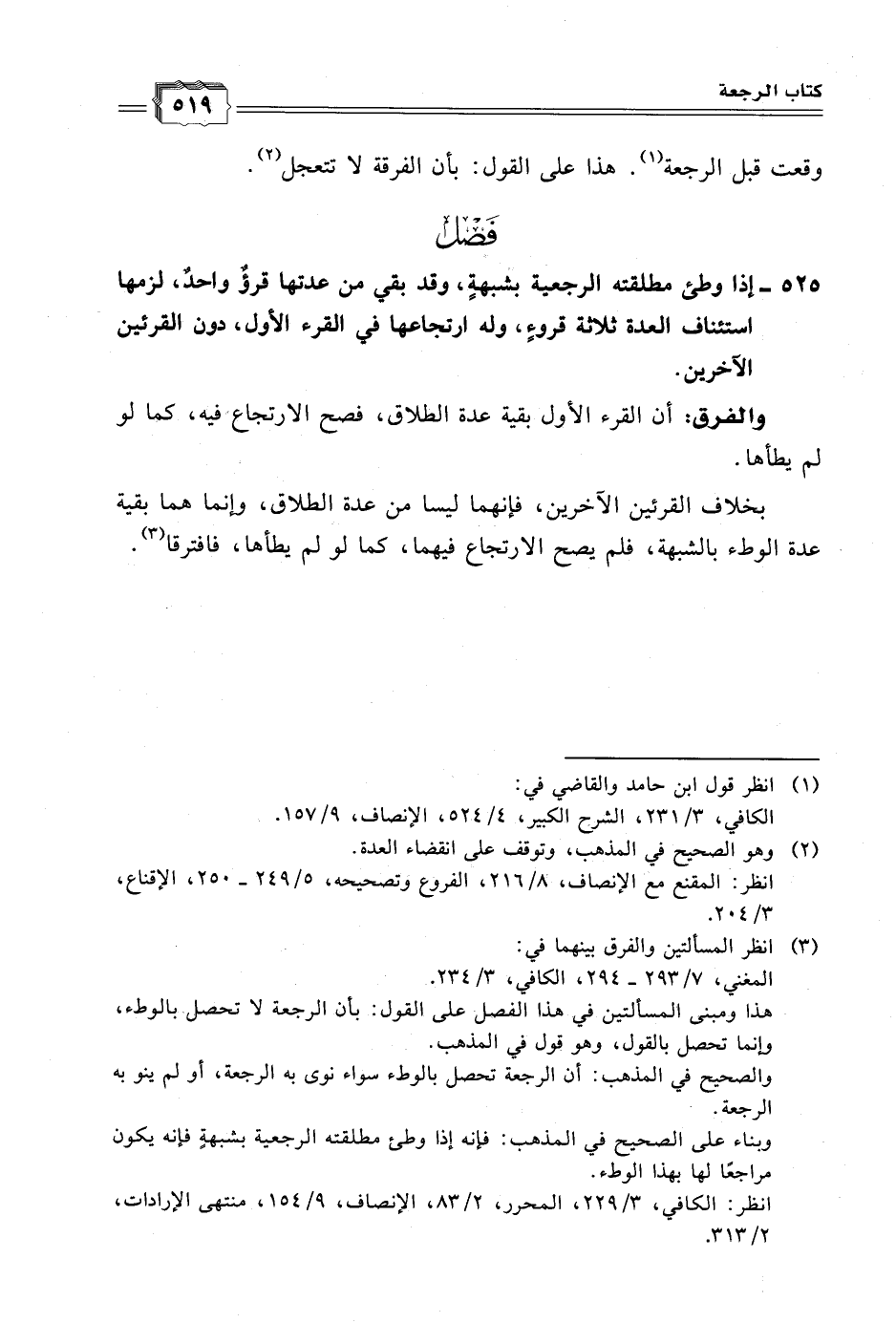 ٥٢٥ - إذا وطئ مطلقته الرجعية بشبهةٍ، وقد بقي من عدتها قرؤٌ واحدٌ، لزمها استئناف العدة ثلاثة قروءٍ، وله ارتجاعها في القرء الأول، دون القرئين الآخرين.