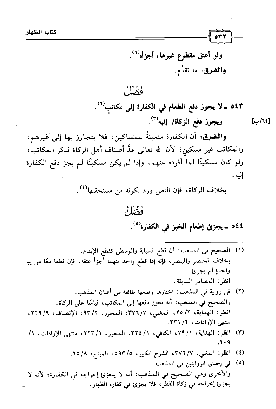 ٥٤٣ - لا يجوز دفع الطعام في الكفارة إلى مكاتبٍ (٢).