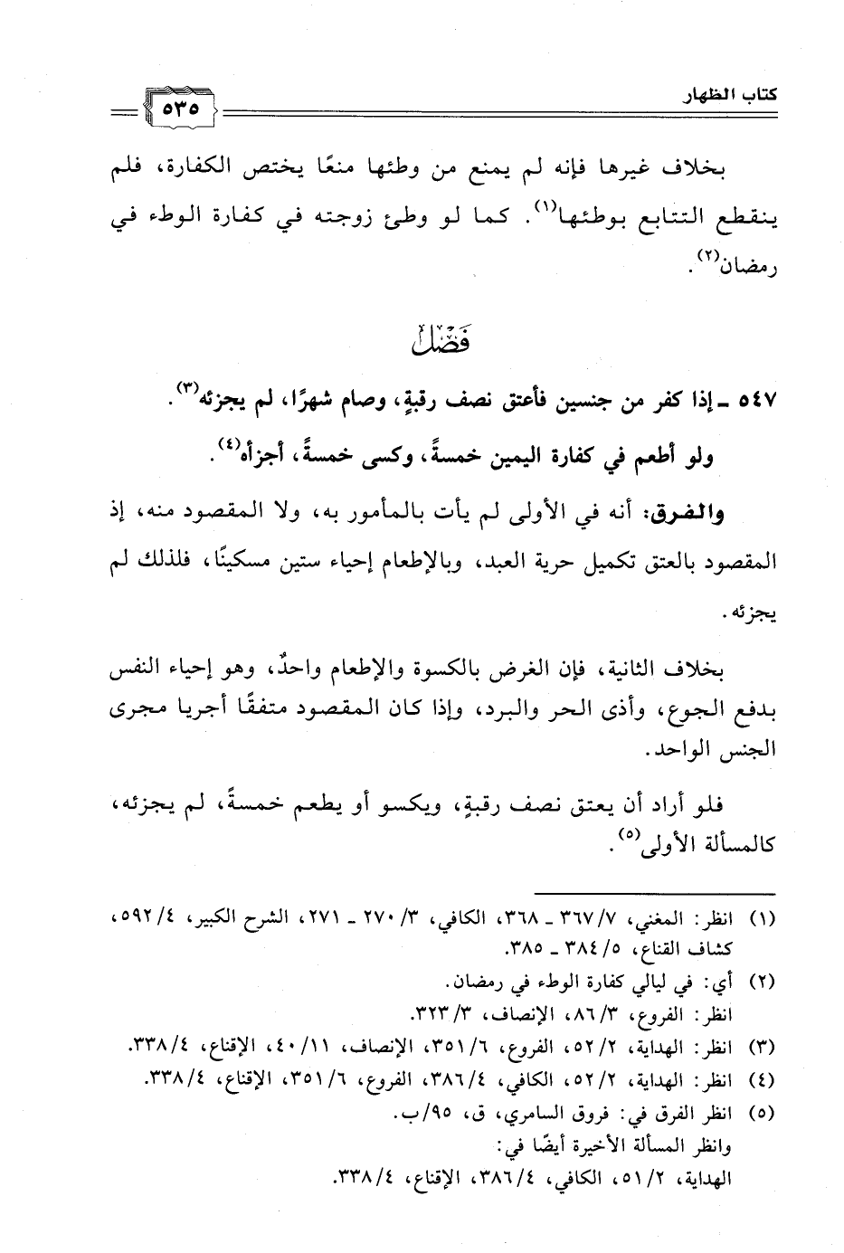 ٥٤٧ - إذا كفر من جنسين فأعتق نصف رقبةٍ، وصام شهرًا، لم يجزئه (٣).