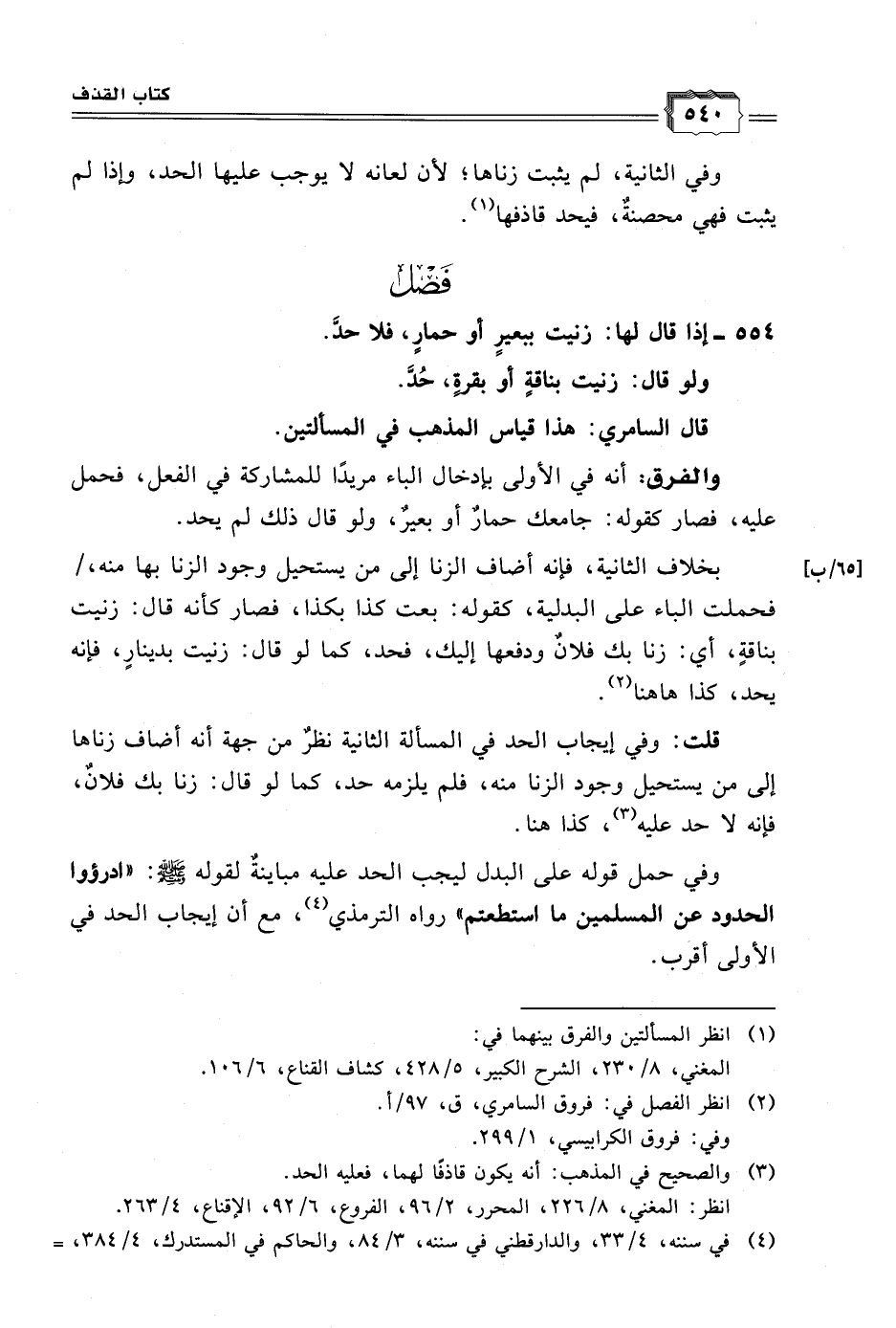 ٥٥٤ - إذا قال لها: زنيت ببعيرٍ أو حمارٍ، فلا حدَّ.