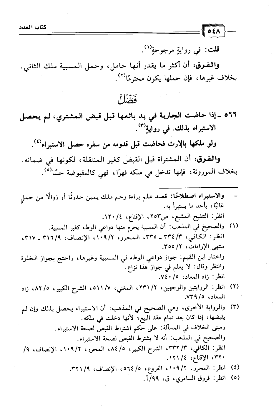 (٤) انظر: المحرر، ٢/ ١٠٩، الفروع، ٥/ ٥٦٤، الإنصاف، ٩/ ٣٢١.