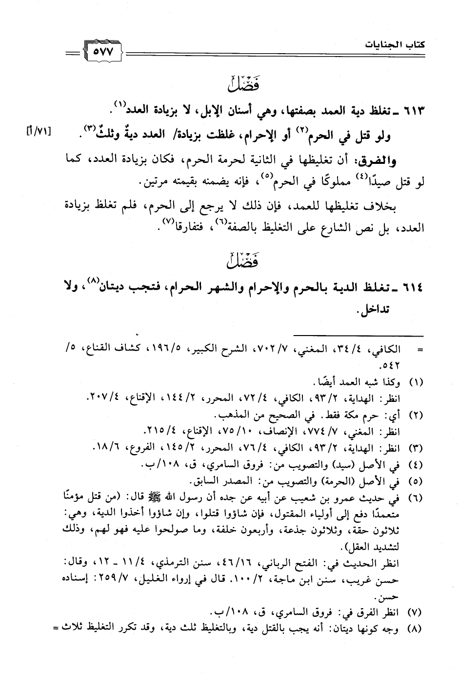 ٦١٣ - تغلظ دية العمد بصفتها، وهي أسنان الإبل، لا بزيادة العدد (١).