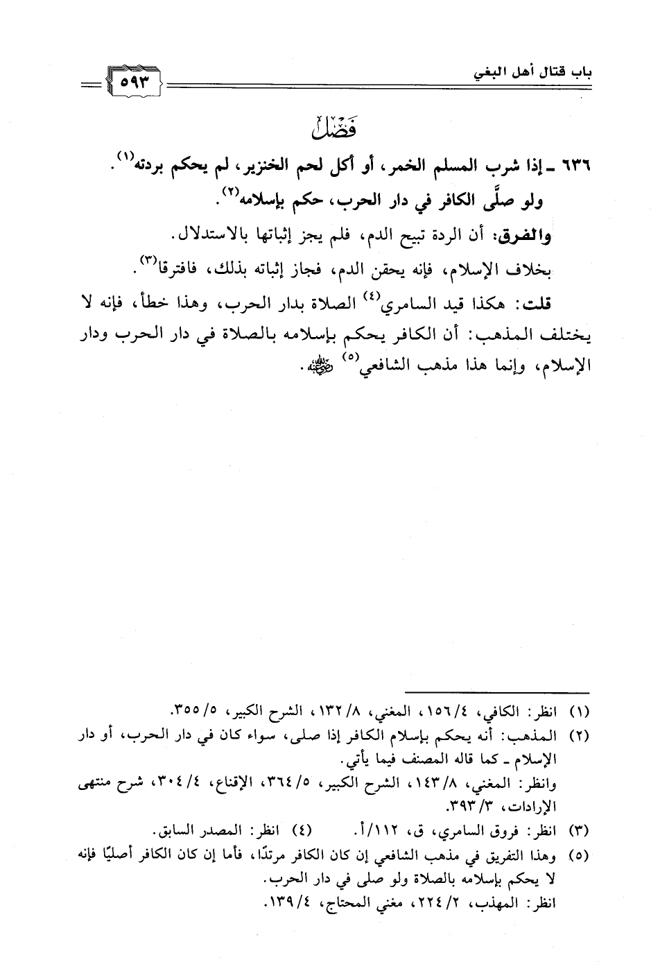 (٥) وهذا التفريق في مذهب الشافعي إن كان الكافر مرتداً، فأما إن كان الكافر أصلياً فإنَّه لا يحكم بإسلامه بالصلاة ولو صلى في دار الحرب.