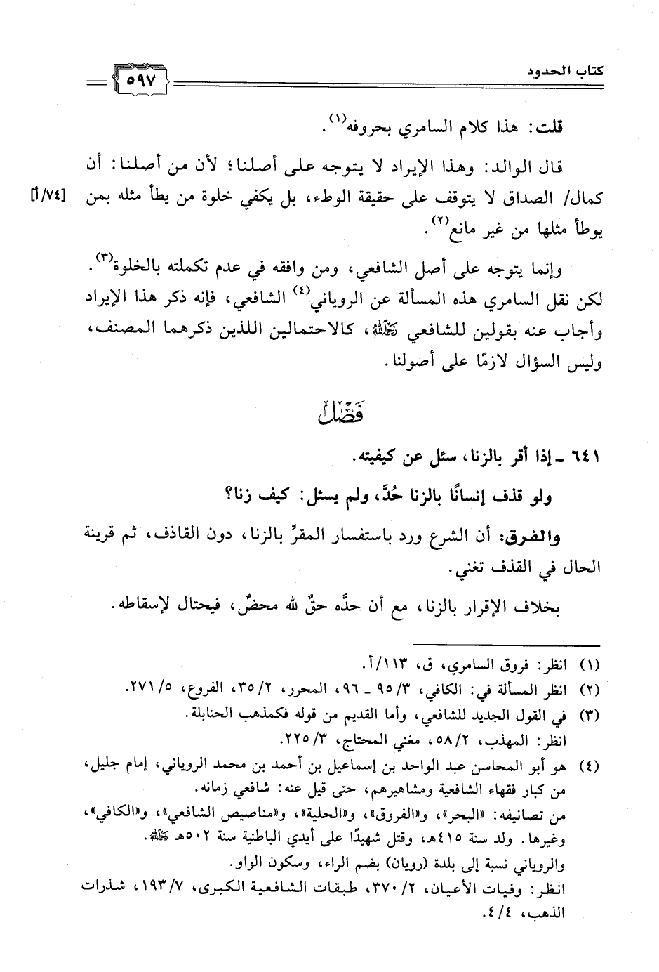 (٤) هو أبو المحاسن عبد الواحد بن إسماعيل بن أحمد بن محمَّد الروياني، إمام جليل، من كبار فقهاء الشافعية ومشاهيرهم، حتى قيل عنه: شافعي زمانه.