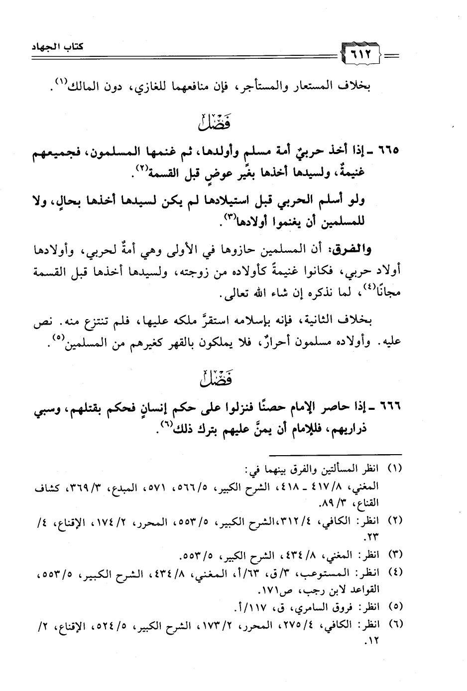 ٦٦٥ - إذا أخذ حربيٌّ أمة مسلمٍ وأولدها، ثم غنمها المسلمون، فجميعهم غنيمة، ولسيدها أخذها بغير عوضٍ قبل القسمة (٢).