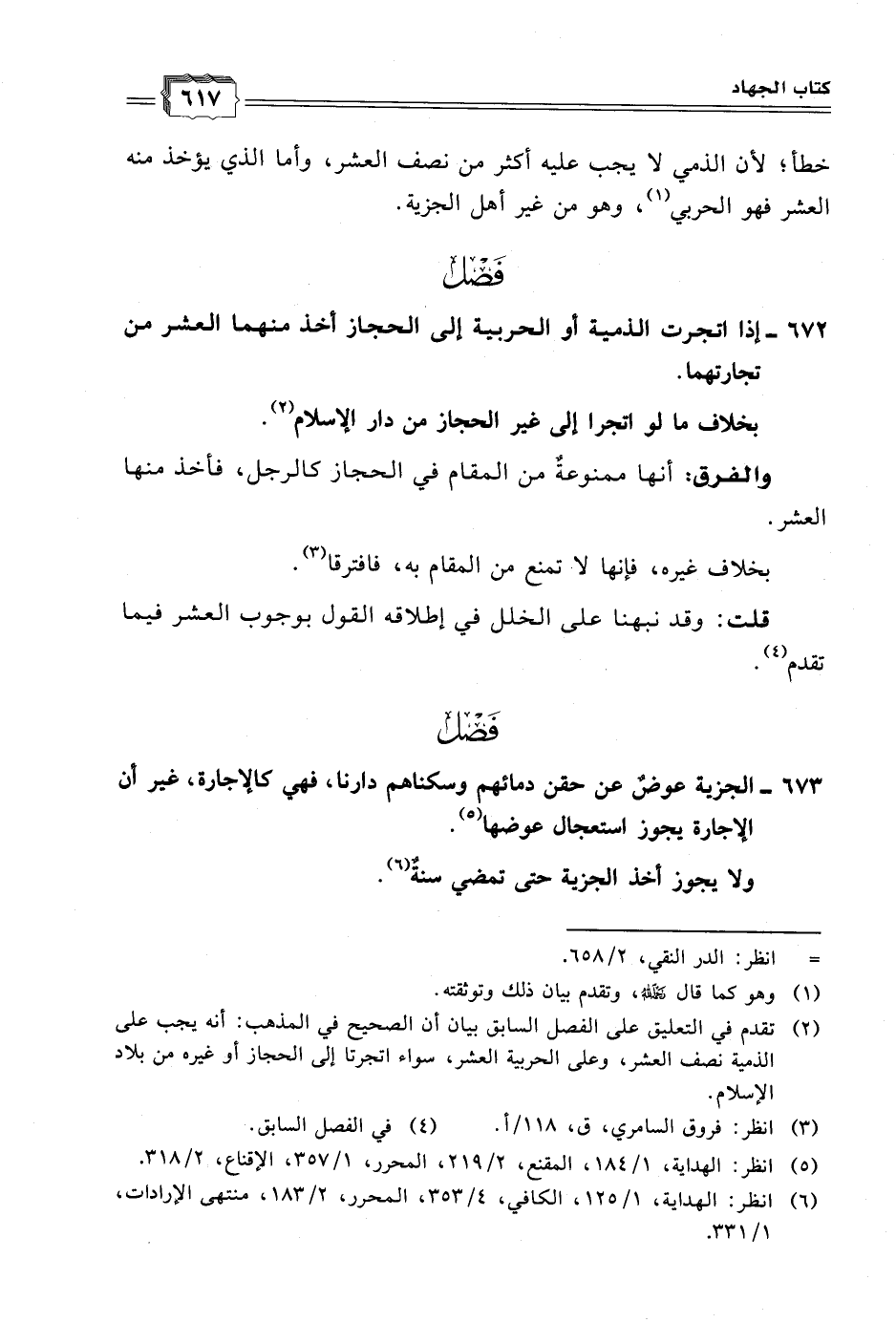(٢) تقدم في التعليق على الفصل السابق بيان أن الصَّحيح في المذهب: أنَّه يجب على الذمية نصف العشر، وعلى الحربية العشر، سواء اتجرتا إلى الحجاز أو غيره من بلاد الإسلام.