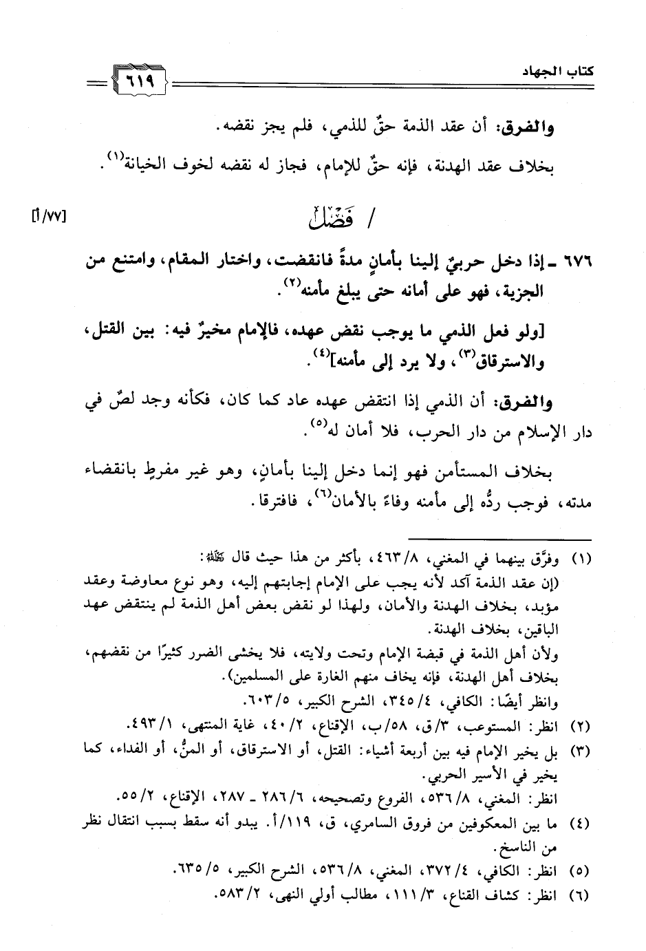 (١) وفرَّق بينهما في المغني، ٨/ ٤٦٣، بأكثر من هذا حيث قال - رحمه الله -: (إن عقد الذمة آكد لأنَّه يجب على الإمام إجابتهم إليه، وهو نوع معاوضة وعقد مؤبد، بخلاف الهدنة والأمان، ولهذا لو نقض بعض أهل الذمة لم ينتقض عهد الباقين، بخلاف الهدنة.