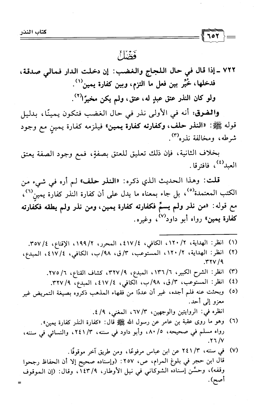قلت: وهذا الحديث الذي ذكره: "النذر حلف" لم أره في شيء من الكتب المعتمدة (٥)، بل جاء بمعناه ما يدل على أن كفارة النذر كفارة يمينٍ (٦)، مع قوله: "من نذر ولم يسمِّ فكفارته كفارة يمين، ومن نذر ولم يطقه فكفارته كفارة يمين" رواه أبو داود (٧)، وغيره.