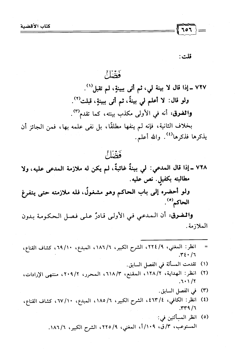 ٧٢٨ - إذا قال المدعي: لي بينةٌ غائبةٌ، لم يكن له ملازمة المدعى عليه، ولا مطالبته بكفيلٍ. نص عليه.