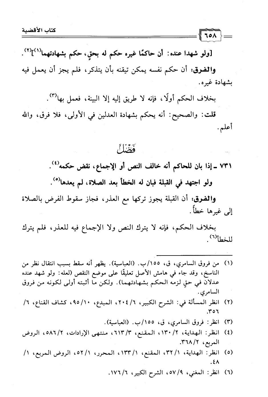 (١) من فروق السامري، ق، ١٥٥/ ب. (العباسية). يظهر أنه سقط بسبب انتقال نظر من الناسخ، وقد جاء في هامش الأصل تعليقًا على موضع النقص (لعله: ولو شهد عنده عدلان في حقٍ لزمه الحكم بشهادتهما). ولكن ما أثبته أولى لكونه من فروق