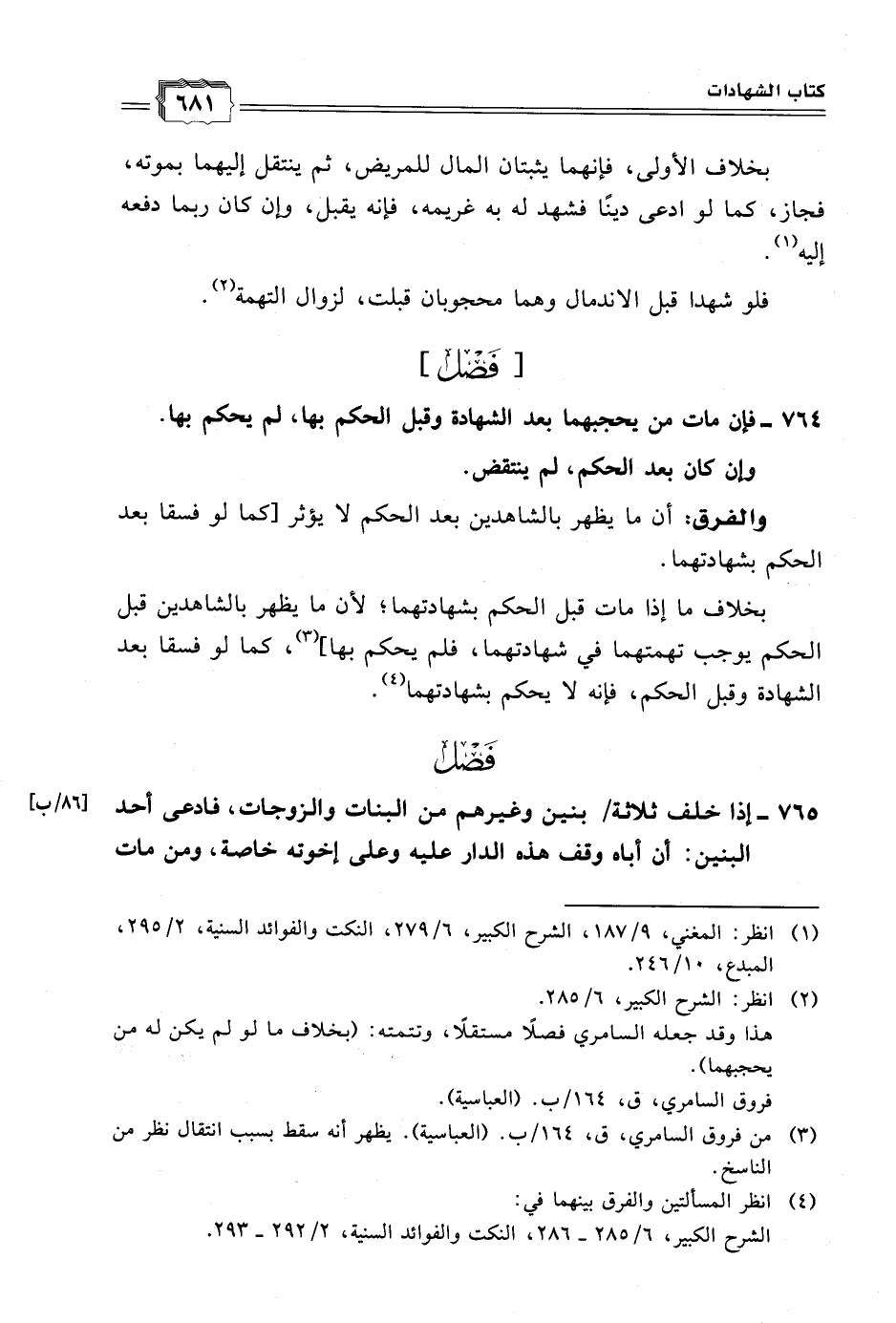 ٧٦٤ - فإن مات من يحجبهما بعد الشهادة وقبل الحكم بها، لم يحكم بها.