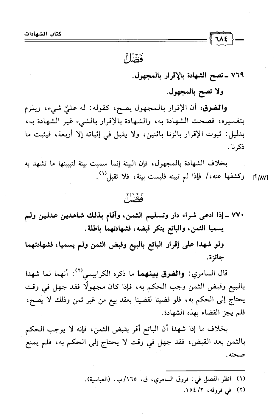 ٧٦٩ - تصح الشهادة بالإقرار بالمجهول.