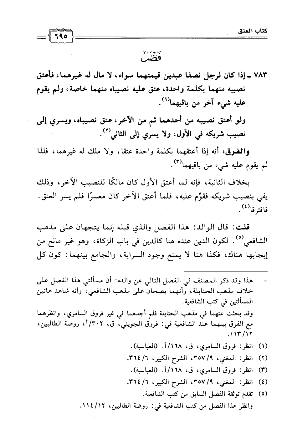 قلت: قال الوالد: هذا الفصل والذي قبله إنما يتجهان على مذهب الشافعي (٥). لكون الدين عنده هنا كالدين في باب الزكاة، وهو غير مانع من إيجابها هناك، فكذا هنا لا يمنع وجود السراية، والجامع بينهما: كون كل