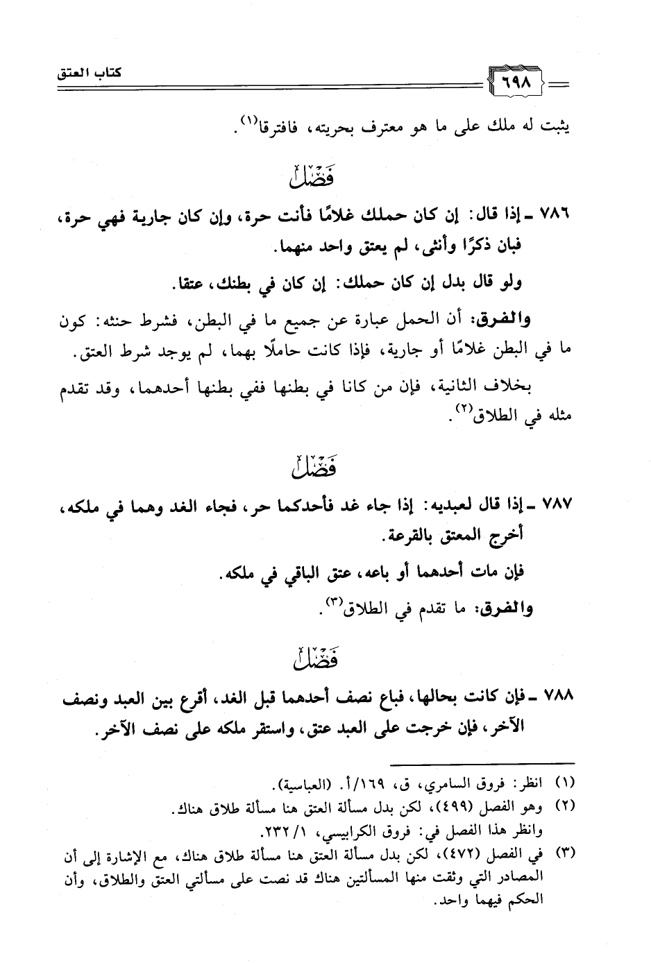 (٢) وهو الفصل (٤٩٩)، لكن بدل مسألة العتق هنا مسألة طلاق هناك.
