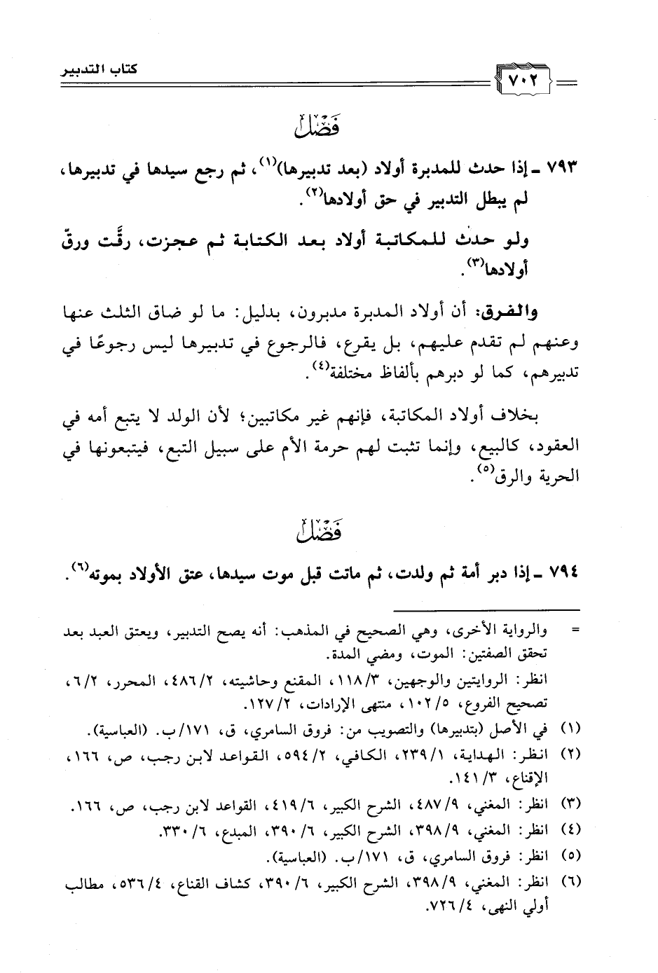 ٧٩٣ - إذا حدث للمدبرة أولاد (بعد تدبيرها) (١)، ثم رجع سيدها في تدبيرها، لم يبطل التدبير في حق أولادها (٢).