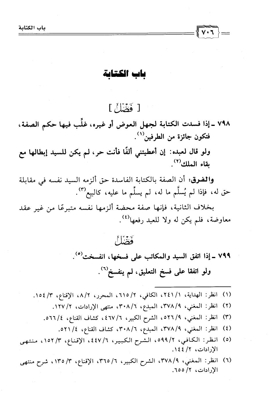 ٧٩٨ - إذا فسدت الكتابة لجهل العوض أو غيره، غلِّب فيها حكم الصفة، فتكون جائزة من الطرفين (١).