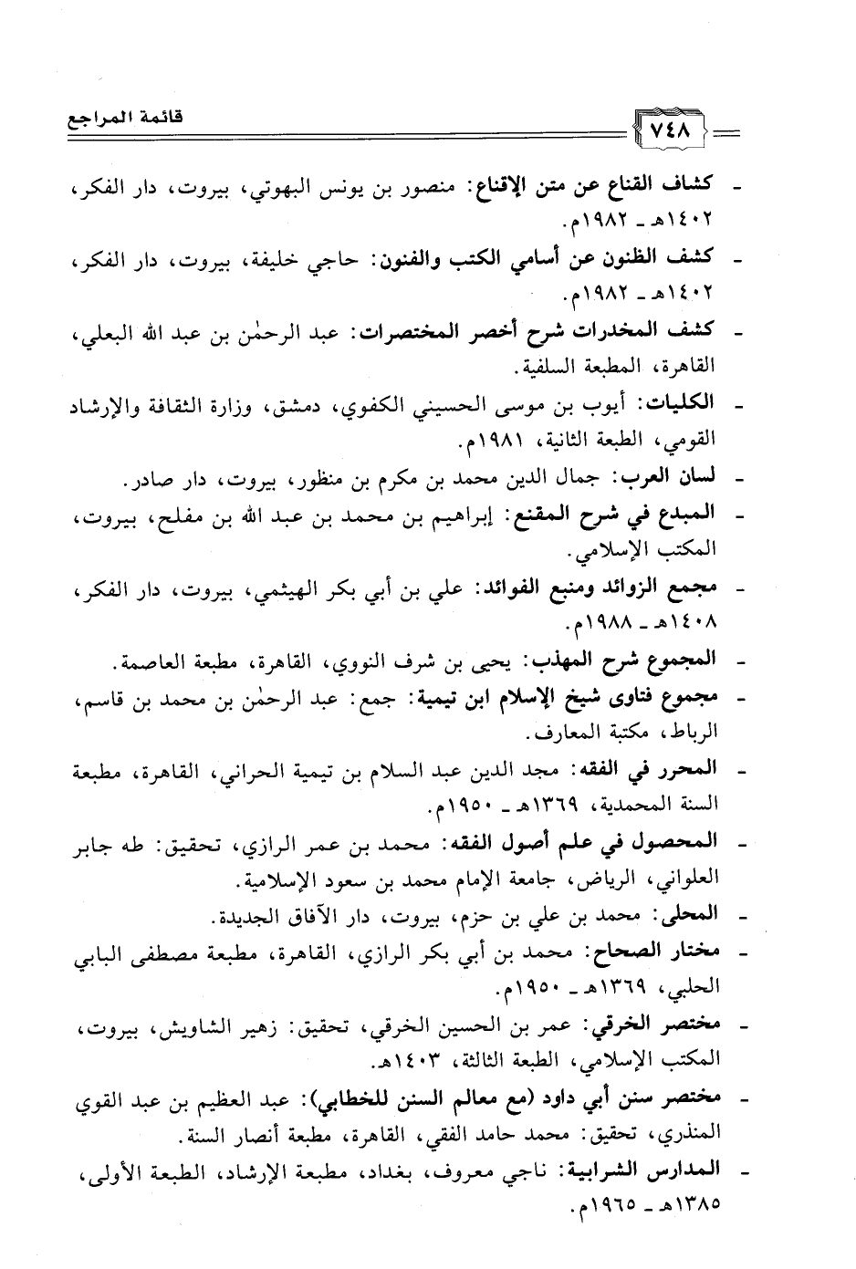 - كشاف القناع عن متن الإقناع: منصور بن يونس البهوتي، بيروت، دار الفكر، ١٤٠٢ هـ - ١٩٨٢ م.