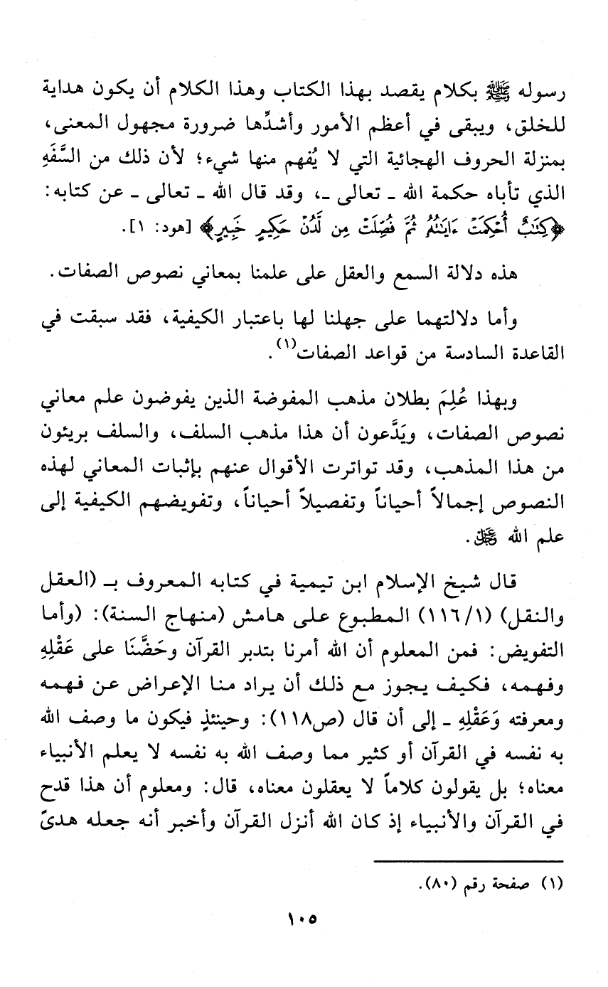 رسوله - صلى الله عليه وسلم - بكلام يقصد بهذا الكتاب، وهذا الكلام أن يكون هداية للخلق، ويبقى في أعظم الأمور وأشدِّها ضرورة مجهول المعنى، بمنزلة الحروف الهجائية التي لا يُفهم منها شيء؛ لأن ذلك من السَّفَهِ الذي تأباه حكمة الله - تعالى -، وقد قال الله - تعالى - عن كتابه: " كِتَابٌ أُحْكِمَتْ آيَاتُهُ ثُمَّ فُصِّلَتْ مِنْ لَدُنْ حَكِيمٍ خَبِيرٍ " [هود: 1].