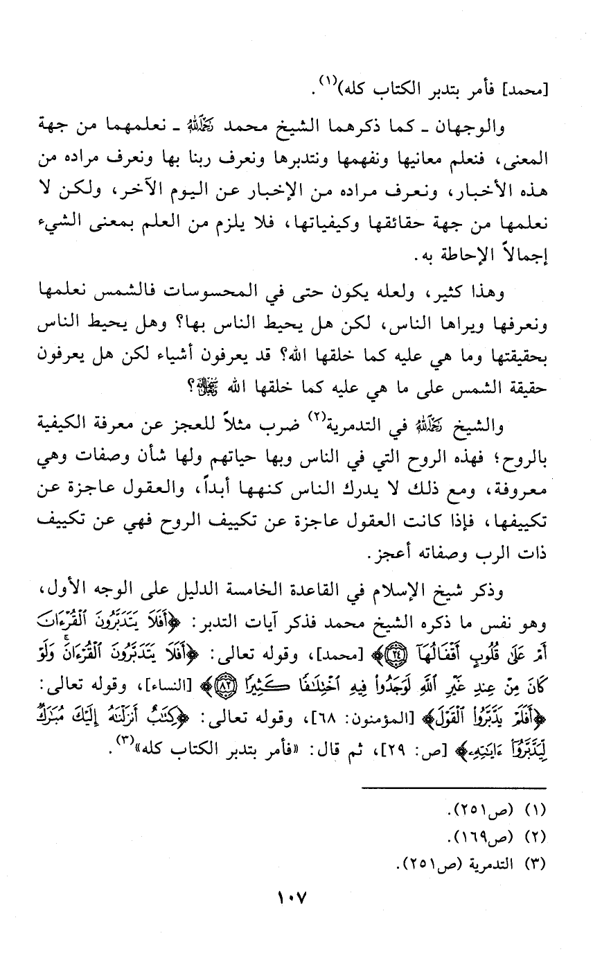 وذكر شيخ الإسلام في القاعدة الخامسة الدليل على الوجه الأول , وهو نفس ما ذكره الشيخ محمد فذكر آيات التدبر: " أفلا يتدبرون القرآن أم على قلوب أقفالها " [محمد: 24]، وقوله تعالى: " أفلا يتدبرون القرآن ولو كان من عند غير الله لوجدوا فيه اختلافًا كثيرًا " [النساء: 82]، وقوله تعالى: " أفلم يدبروا القول " [المؤمنون: 68]، وقوله تعالى: " كتاب أنزلناه إليك مبارك ليدبروا آياته " [ص: 29]، ثم قال: (فأمر بتدبر الكتاب كله) (¬3).