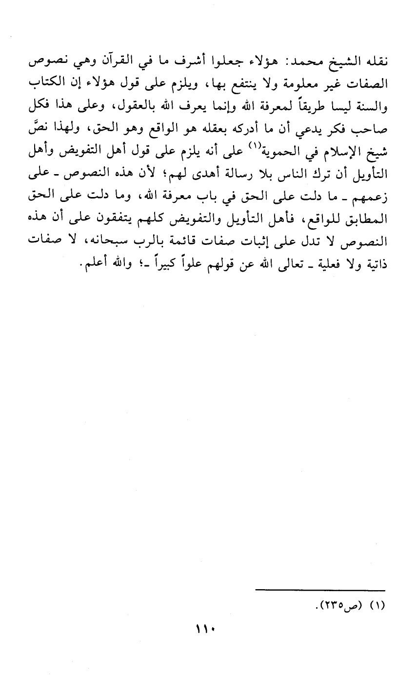نقله الشيخ محمد: هؤلاء جعلوا أشرف ما في القرآن وهي نصوص الصفات غير معلومة ولا ينتفع بها , ويلزم على قول هؤلاء إن الكتاب والسنة ليسا طريقا لمعرفة الله وإنما يعرف الله بالعقول , وعلى هذا فكل صاحب فكر يدعي أن ما أدركه بعقله هو الواقع وهو الحق , ولهذا نصَّ شيخ الإسلام في الحموية (¬1) على أنه يلزم على قول أهل التفويض وأهل التأويل أن ترك الناس بلا رسالة أهدى لهم , لأن هذه النصوص - على زعمهم - ما دلت على الحق في باب معرفة الله , وما دلت على الحق المطابق للواقع , فأهل التأويل والتفويض كلهم يتفقون على أن هذه النصوص لا تدل على إثبات صفات قائمة بالرب سبحانه , لا صفات ذاتية ولا فعلية - تعالى الله عن قولهم علوًا كبيرًا -؛ والله أعلم.