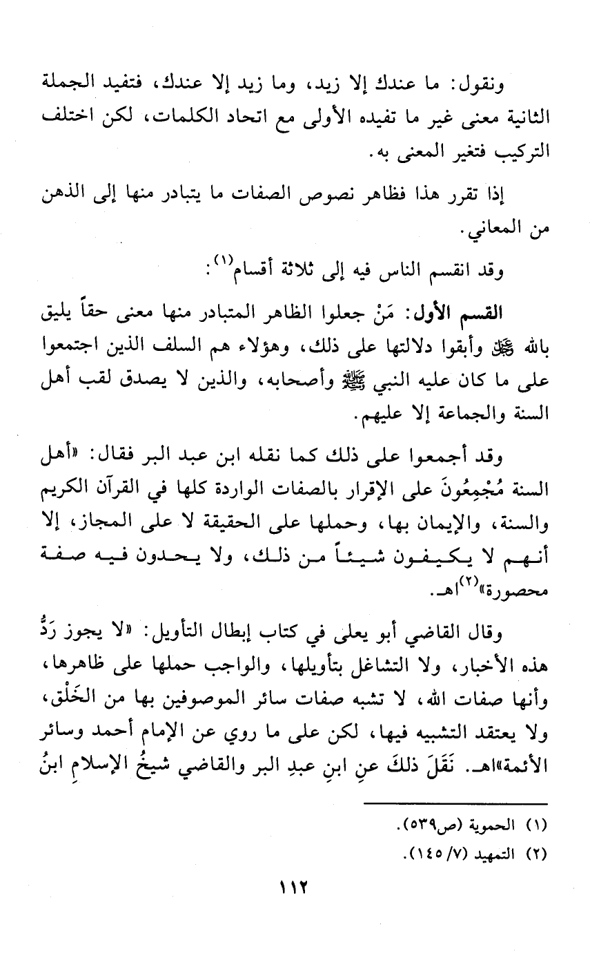 القسم الأول: مَنْ جعلوا الظاهر المتبادر منها معنى حقًا يليق بالله - عز وجل - وأبقوا دلالتها على ذلك، وهؤلاء هم السلف الذين اجتمعوا على ما كان عليه النبي - صلى الله عليه وسلم - وأصحابه، والذين لا يصدق لقب أهل السنة والجماعة إلا عليهم.