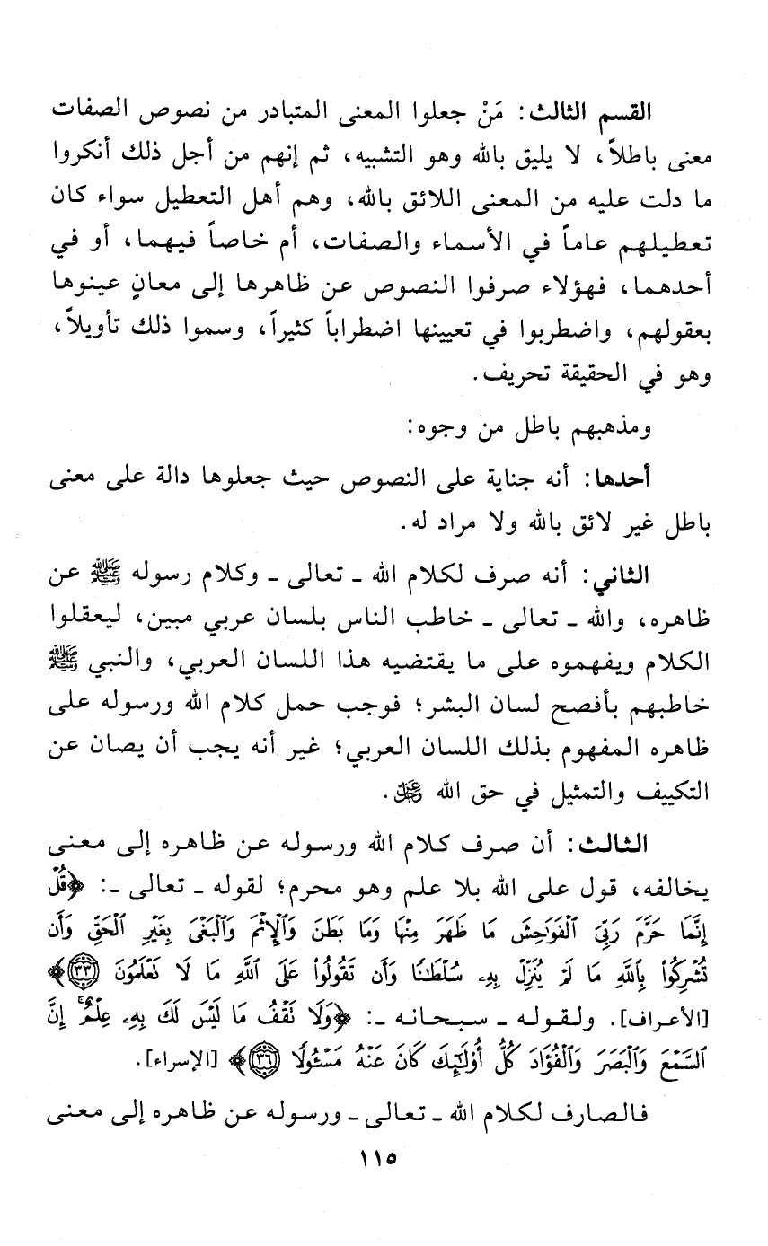 الثاني: أنه صرف لكلام الله - تعالى - وكلام رسوله - صلى الله عليه وسلم - عن ظاهره، والله - تعالى - خاطب الناس بلسان عربي مبين، ليعقلوا الكلام ويفهموه على ما يقتضيه هذا اللسان العربي، والنبي - صلى الله عليه وسلم - خاطبهم بأفصح لسان البشر؛ فوجب حمل كلام الله ورسوله على ظاهره المفهوم بذلك اللسان العربي؛ غير أنه يجب أن يصان عن التكييف والتمثيل في حق الله - عز وجل -.