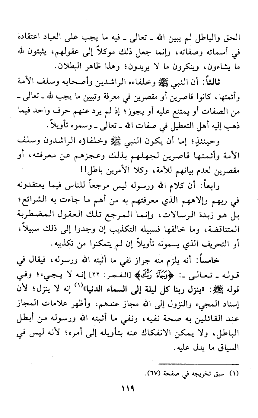ثالثًا: أن النبي - صلى الله عليه وسلم - وخلفاءه الراشدين وأصحابه وسلف الأمة وأئمتها، كانوا قاصرين أو مقصرين في معرفة وتبيين ما يجب لله - تعالى - من الصفات أو يمتنع عليه أو يجوز؛ إذ لم يرد عنهم حرف واحد فيما ذهب إليه أهل التعطيل في صفات الله - تعالى - وسموه تأويلًا.