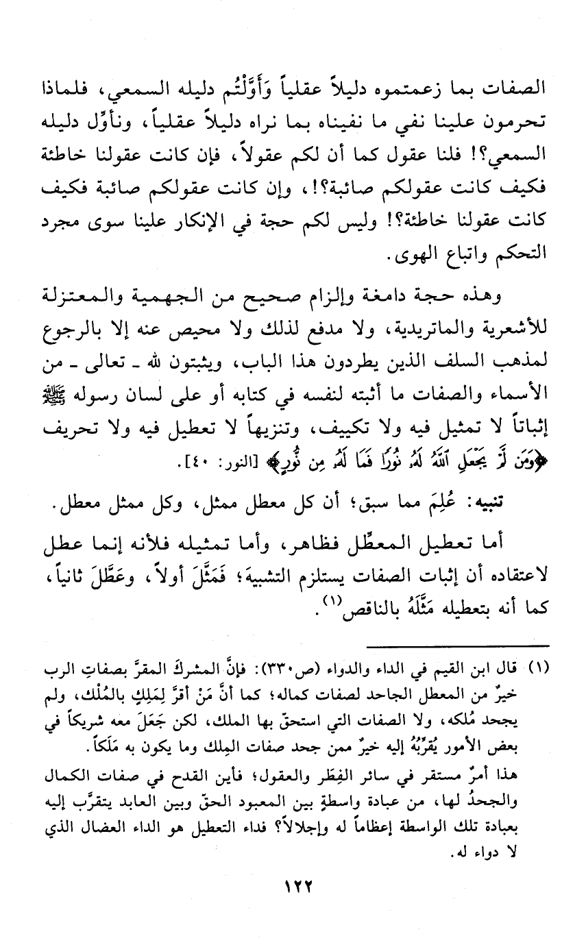 (¬1) قال ابن القيم في الداء والدواء (ص 330): فإنَّ المشركَ المقرَّ بصفاتِ الرب خيرٌ من المعطل الجاحد لصفات كماله؛ كما أنَّ مَنْ أقرَّ لِمَلِكٍ بالمُلْك، ولم يجحد مُلكه، ولا الصفات التي استحقّ بها الملك، لكن جَعَلَ معه شريكًا في بعض الأمور يُقرِّبُهُ إليه = خيرٌ ممن جحد صفات المِلك وما يكون به مَلَكًا.