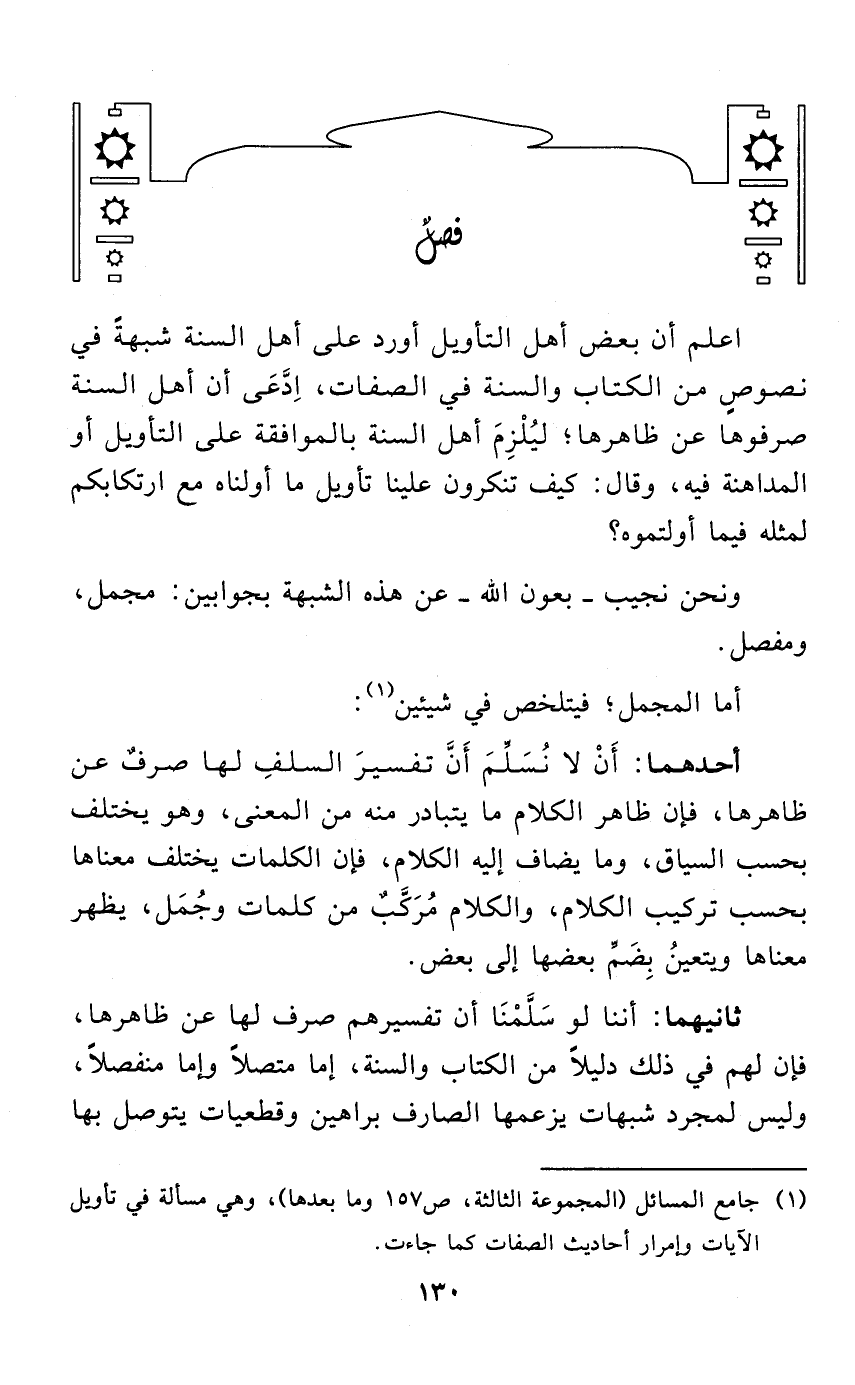 (¬1) جامع المسائل (المجموعة الثالثة / 157 وما بعدها)، وهي مسألة في تأويل الآيات وإمرار أحاديث الصفات كما جاءت.