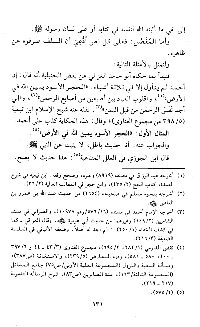 فنبدأ بما حكاه أبو حامد الغزالي عن بعض الحنبلية أنه قال: إن أحمد لم يتأول إلا في ثلاثة أشياء: " الحجر الأسود يمين الله في الأرض " (¬1)، و " قلوب العباد بين أصبعين من أصابع الرحمن " (¬2)، و " إني أجد نَفَسَ الرحمن من قبل اليمن " (¬3). نقله عنه شيخ الإسلام ابن تيمية (ص 398 / جـ 5 من مجموع الفتاوى)؛ وقال: هذه الحكاية كذب على أحمد.