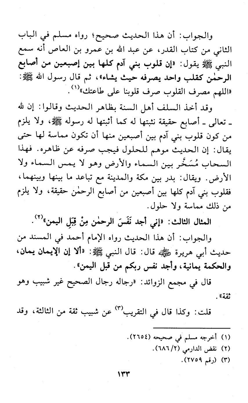 والجواب: أن هذا الحديث صحيح؛ رواه مسلم في الباب الثاني من كتاب القدر، عن عبد الله بن عمرو بن العاص أنه سمع النبي - صلى الله عليه وسلم - يقول: " إن قلوب بني آدم كلها بين إصبعين من أصابع الرحمن كقلب واحد يصرفه حيث يشاء "، ثم قال رسول الله - صلى الله عليه وسلم -: " اللهم مصرف القلوب صرف قلوبنا على طاعتك " (¬1).