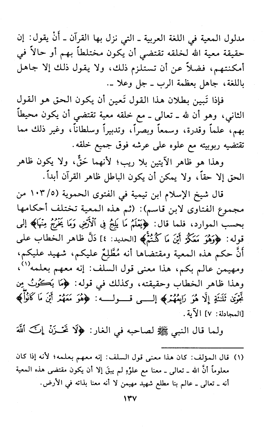 قال شيخ الإسلام ابن تيمية في الفتوى الحموية (ص 103 / جـ 5 من مجموع الفتاوى لابن قاسم): (ثم هذه المعية تختلف أحكامها بحسب الموارد، فلما قال: " يَعْلَمُ مَا يَلِجُ فِي الْأَرْضِ وَمَا يَخْرُجُ مِنْهَا " إلى قوله: " وَهُوَ مَعَكُمْ أَيْنَ مَا كُنْتُمْ " [الحديد: 4] دَلَّ ظاهر الخطاب على أَنَّ حكم هذه المعية ومقتضاها أنه مُطَّلِعٌ عليكم، شهيد عليكم، ومهيمن عالم بكم، هذا معنى قول السلف: إنه معهم بعلمه (¬1)، وهذا ظاهر الخطاب وحقيقته، وكذلك في قوله: " مَا يَكُونُ مِنْ نَجْوَى ثَلاثَةٍ إِلَّا هُوَ رَابِعُهُمْ " إلى قوله: " هُوَ مَعَهُمْ أَيْنَ مَا كَانُوا " [المجادلة: 7] الآية.