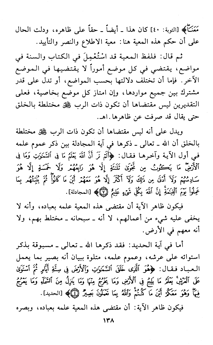 ويدل على أنه ليس مقتضاها أن تكون ذات الرب – عز وجل – مختلطة بالخلق أن الله – تعالى – ذكرها في آية المجادلة بين ذكر عموم علمه في أول الآية وآخرها فقال: " أَلَمْ تَرَ أَنَّ اللَّهَ يَعْلَمُ مَا فِي السَّمَاوَاتِ وَمَا فِي الْأَرْضِ مَا يَكُونُ مِنْ نَجْوَى ثَلاثَةٍ إِلَّا هُوَ رَابِعُهُمْ وَلا خَمْسَةٍ إِلَّا هُوَ سَادِسُهُمْ وَلا أَدْنَى مِنْ ذَلِكَ وَلا أَكْثَرَ إِلَّا هُوَ مَعَهُمْ أَيْنَ مَا كَانُوا ثُمَّ يُنَبِّئُهُمْ بِمَا عَمِلُوا يَوْمَ الْقِيَامَةِ إِنَّ اللَّهَ بِكُلِّ شَيْءٍ عَلِيمٌ " [المجادلة: 7].