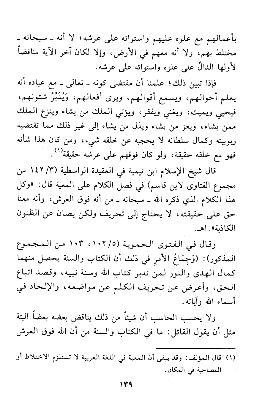 قال شيخ الإسلام ابن تيمية في العقيدة الواسطية (ص 142 / جـ 3 من مجموع الفتاوى لابن قاسم) في فصل الكلام على المعية قال: (وكل هذا الكلام الذي ذكره الله – سبحانه – من أنه فوق العرش، وأنه معنا حق على حقيقته، لا يحتاج إلى تحريف ولكن يصان عن الظنون الكاذبة). اهـ.