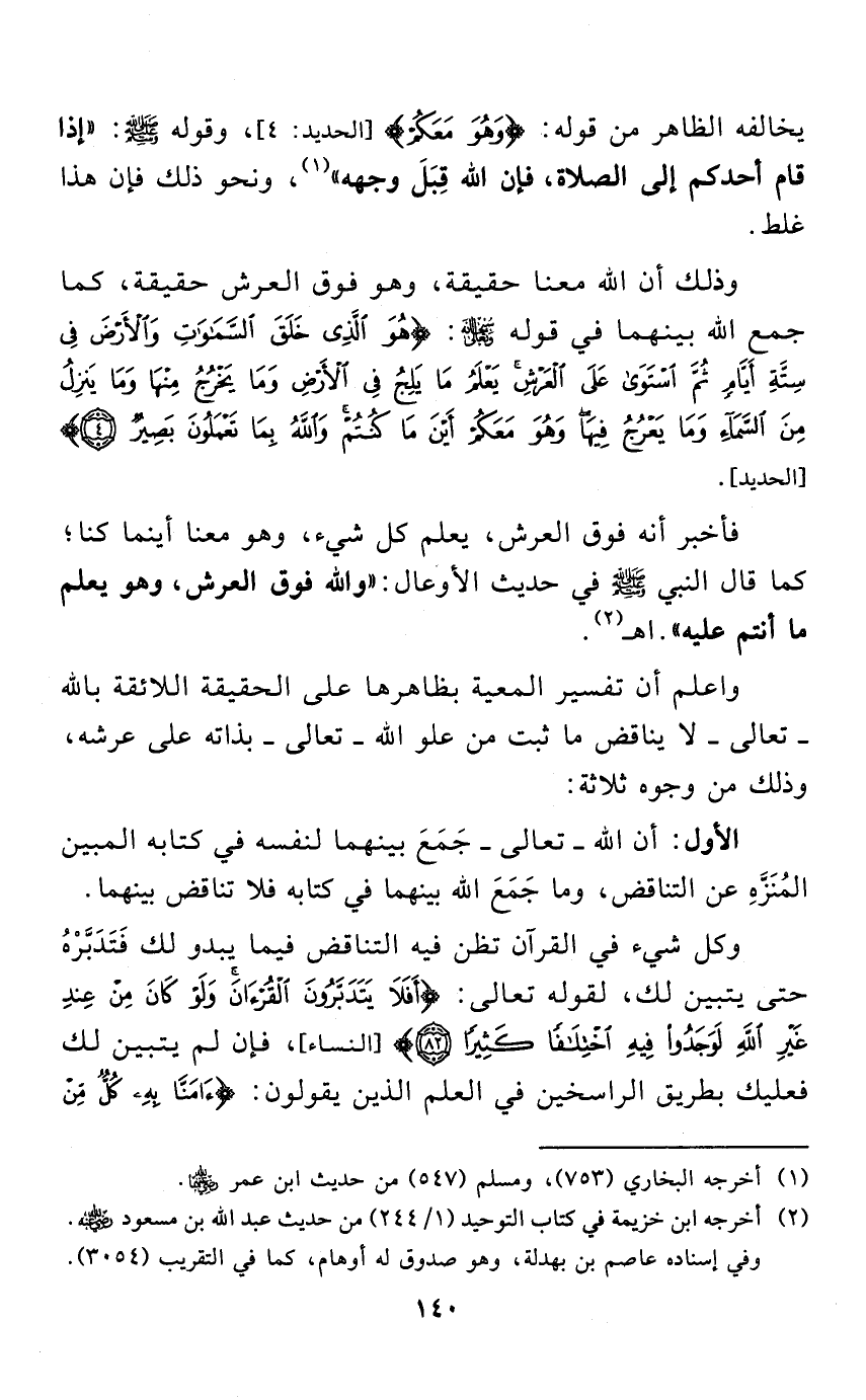 وذلك أن الله معنا حقيقة، وهو فوق العرش حقيقة، كما جمع الله بينهما في قوله – سبحانه وتعالى –: " هُوَ الَّذِي خَلَقَ السَّمَاوَاتِ وَالْأَرْضَ فِي سِتَّةِ أَيَّامٍ ثُمَّ اسْتَوَى عَلَى الْعَرْشِ يَعْلَمُ مَا يَلِجُ فِي الْأَرْضِ وَمَا يَخْرُجُ مِنْهَا وَمَا يَنْزِلُ مِنَ السَّمَاءِ وَمَا يَعْرُجُ فِيهَا وَهُوَ مَعَكُمْ أَيْنَ مَا كُنْتُمْ وَاللَّهُ بِمَا تَعْمَلُونَ بَصِيرٌ " [الحديد: 4].
