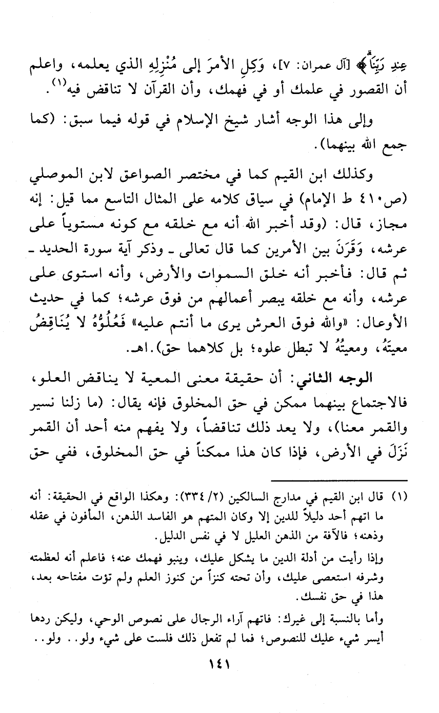 وكذلك ابن القيم كما في مختصر الصواعق لابن الموصلي (ص 410 ط الإمام) في سياق كلامه على المثال التاسع مما قيل: إنه مجاز، قال: (وقد أخبر الله أنه مع خلقه مع كونه مستويًا على عرشه، وَقَرَنَ بين الأمرين كما قال تعالى - وذكر آية سورة الحديد - ثم قال: فأخبر أنه خلق السموات والأرض، وأنه استوى على عرشه، وأنه مع خلقه يبصر أعمالهم من فوق عرشه؛ كما في حديث الأوعال: " والله فوق العرش يرى ما أنتم عليه " فَعُلُوُّهُ لا يُنَاقِضُ معيتَهُ، ومعيتُهُ لا تبطل علوه؛ بل كلاهما حق). اهـ.