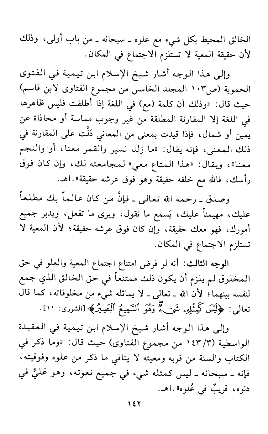 وإلى هذا الوجه أشار شيخ الإسلام ابن تيمية في العقيدة الواسطية (ص 143 / جـ 3 من مجموع الفتاوى) حيث قال: (وما ذكر في الكتاب والسنة من قربه ومعيته لا ينافي ما ذكر من علوه وفوقيته، فإنه – سبحانه – ليس كمثله شيء في جميع نعوته، وهو عَليٌّ في دنوه، قريبٌ في عُلوه). اهـ.